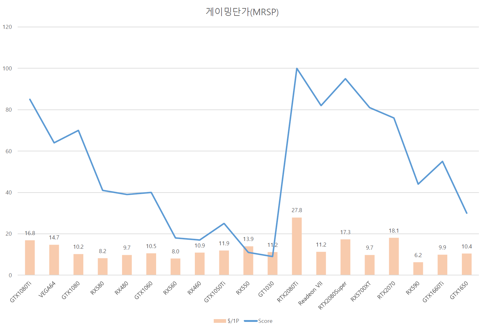 게이밍 2080Ti 100점 기준에서 1점당 칩셋 $가격 AMD는 RX400~Radeon VII에 이르기까지 2016~2018년 동안 같은 게이밍 성능에서, 생산단가가 항상 NVIDIA에 비하여 비쌌다. 2016년의 RX460은 GTX1050Ti보다 성능이 안 좋음에도 1P당 $0.4가 더 비싸게 생산되었다. RX480은 GTX1060보다 게이밍에서 아주 조금 부족하면서도 1P당 $0.3가 비싸게 생산되었다. VEGA64는 GTX1080보다 게이밍에서 약하지만 1P당 생산단가가 2배가 넘는다. 2019년에서 Radeon VII의 게임 성능은 RX5700XT와 비슷하나 1P당 생산단가는 60%정도 더 비싸다. 여기에서 왜 Radeon VII가 일찍 단종 수순에 들어갔는지 알 수 있다. 또한 흥미로운 사실은, RX5700XT는 RTX2070보다 성능이 좋음에도 1P당 생산단가에서 40%정도 더 저렴한 것을 알 수 있다. 여기서 조심스럽게 추측하자면, RTX2070에 들어간 RT코어가 생산단가에서 쓸모없이 차지하는 비용이 좀 된다는 사실이다.