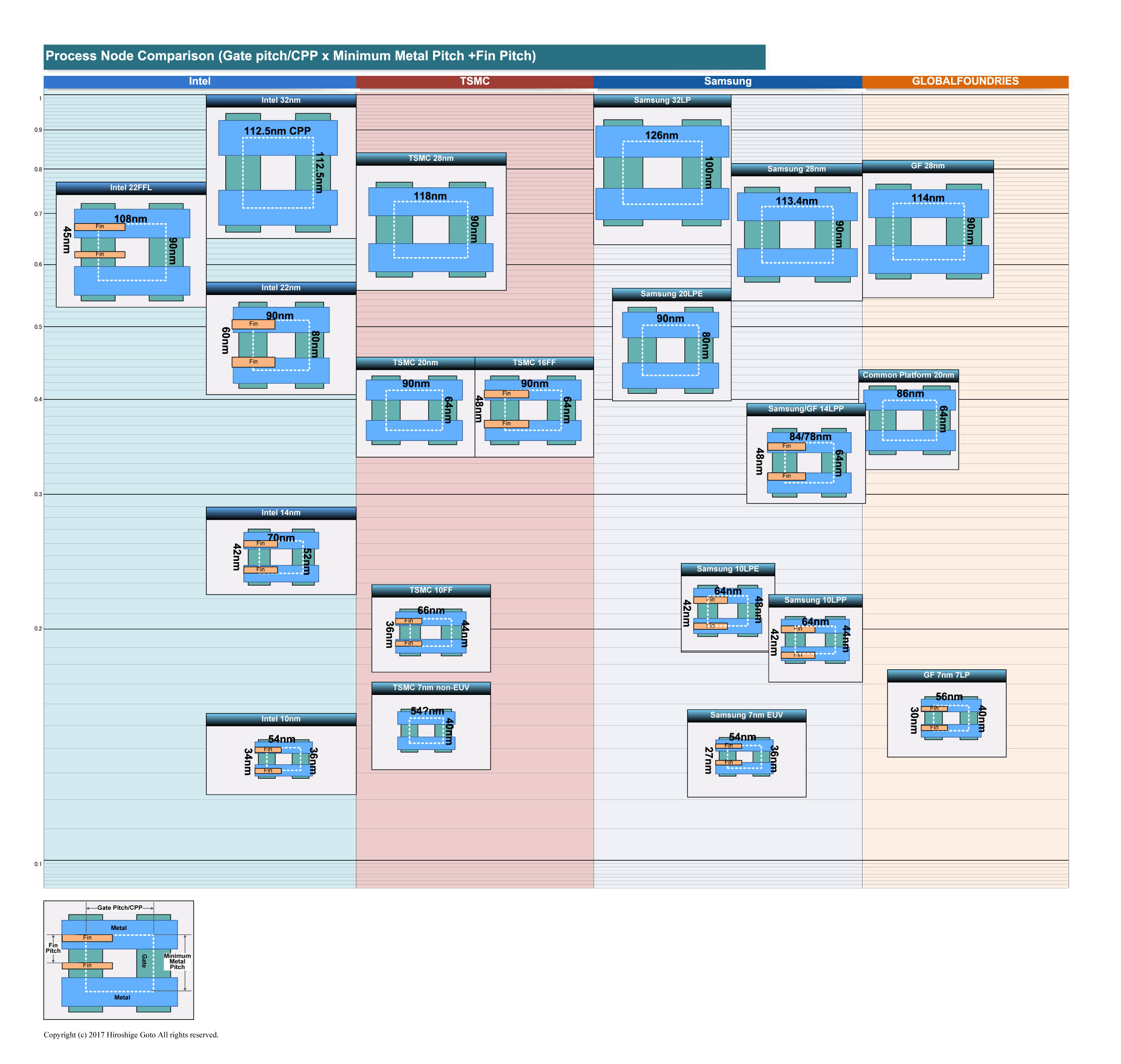 TSMC 16FF ≥ GF 14FF(12nm) ≥ Intel 14nm > TSMC 7nm ArFi ≥ Intel 10nm > 7nmEUV 위 자료는 2018년 7월 3일 자료로, 각 파운드리별로 공정 미세 정보를 나타낸다. 사실상 미세공정일수록 생산 난이도는 높아지고 수율은 낮아진다. 엄밀하게 말하면 TSMC 16FF는 Global Foundries(GF) 14FF보다 덜 미세하나, 큰 차이는 없으므로 일반적으로 완전 같은 세대로 본다. 아이폰6S의 A9는 16FF와 14FF로 같이 생산되었으나 성능의 편차가 거의 없다고 밝혀졌다.