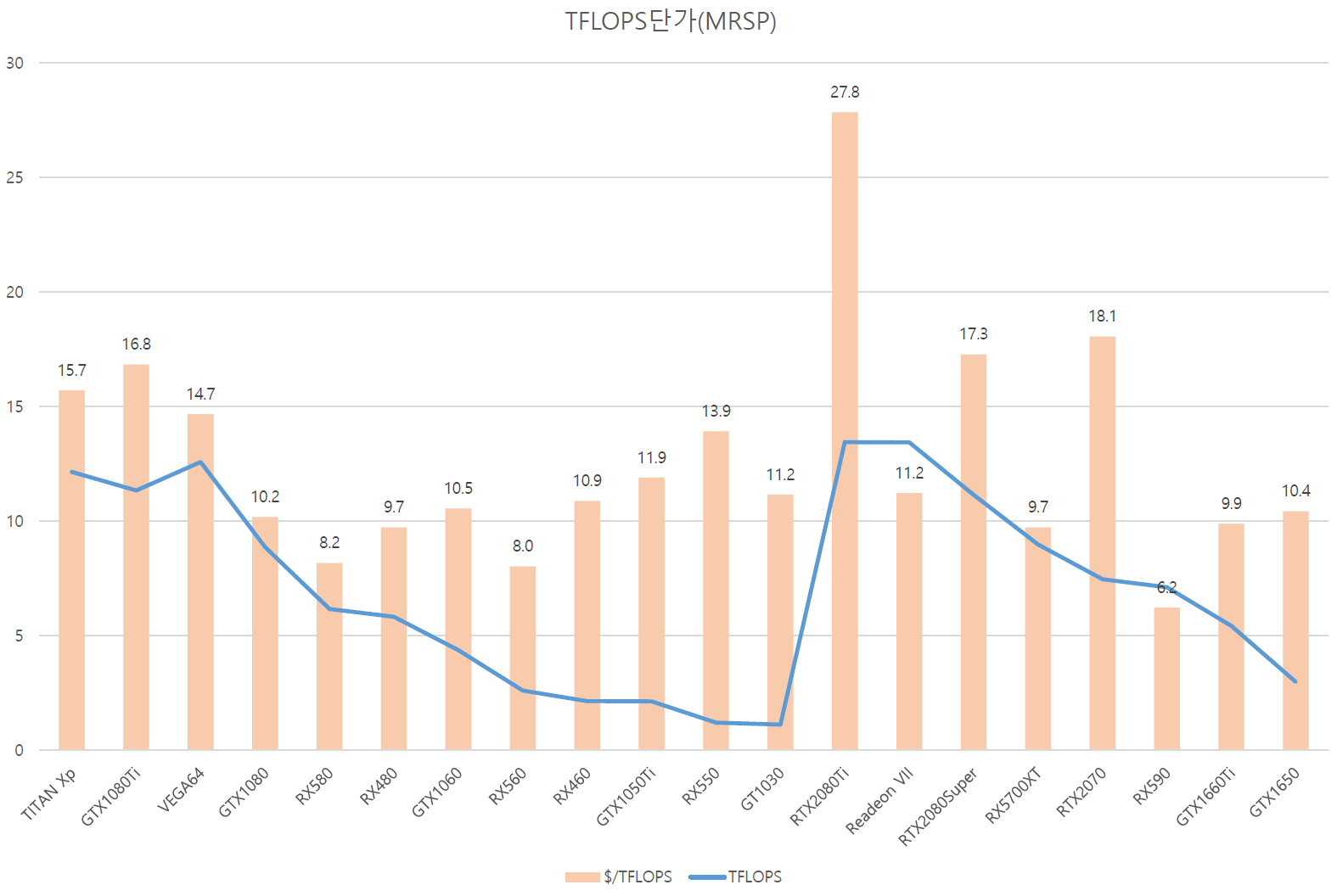 MRSP대비 TFLOPS 성능 전체적으로 AMD는 NVIDIA보다 TFLOPS당 가격이 저렴한 것을 알 수 있다. 특히 Radeon VII의 경우 RTX2080Ti와 TFLOPS성능이 거의 동일하지만 $/TFLOPS가 반토막임을 알 수 있다. 즉, 시장에서의 GPU가격은 사실상 계산 성능이 아닌 게이밍 성능으로 결정된다는 사실을 알 수 있다. 그리고 AMD는 생산단가가 NVIDIA와 거의 흡사하지만 MRSP가 저렴한 것을 볼 때, 고성능 그래픽카드를 많이 판매할수록 판매 이윤이 줄어든다는 것도 알 수 있다. RX580과 같은 라인업을 많이 파는 것이 이윤 확대에 도움이 될 것이다.