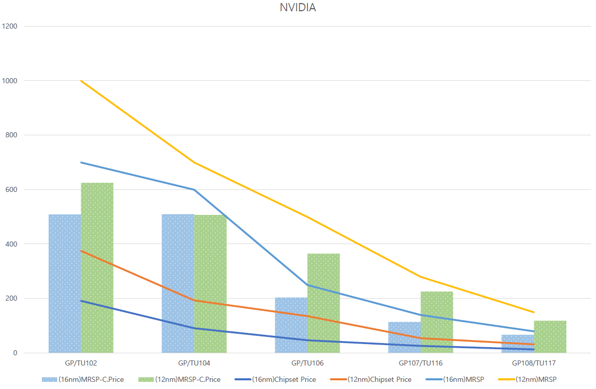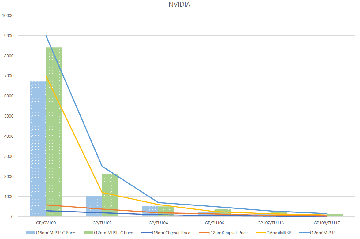 일반 게이밍 기준의 생산단가와 MRSP 위에서는 최상위칩(GP100/GV100)으로 인하여 그래프의 간격을 실감하기 어려웠다. 여기서는 일반사용자가 살법한 가격대 기준으로 살펴보자. 재미있는 것은 12nm에서 16nm에서보다 이윤이 극대화 되는 부분에서 104라인업은 제외된다는 사실이다. 해당 칩셋만큼은 두 공정에서의 이윤은 큰 차이가 없다. 해당 아키텍쳐의 GPU는 1080/2080으로, NVIDIA에서 해당 라인업의 가격만큼은 적정가로 측정하려 노력했다고 추측할 수 있다. 물론, 2080Ti/2070/2060/1660/1650의 경우 경쟁 상대가 마땅찮기 때문에 이윤은 극대화 한 것으로 보인다. 흥미로운 점은 RTX2070이하 라인업에서 실제로 RayTracing 기능은 프레임 반토막 때문에 쓰기 힘든 기능이다. 하지만 RT코어 탑재를 이유로 이윤을 극대화 한 사실을 알 수 있다. 젠슨 황의 입털기를 세계 최고였다. 실제 쓰지 못하는 기능을 핑계로 칩 크기를 키우고, 이윤은 더 늘린 것이다.