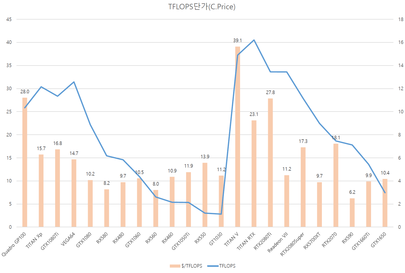 칩셋 단가 대비 TFLOPS 성능 NVIDIA는 라인업을 크게 3가지로 나눈다. 먼저 GTX/RTX와 Quadro라인업의 아키텍쳐 구분이다. 큰 차이는 바로 계산성능을 줄이고 게임성능을 최적화 시킨 것이 GTX/RTX라인업이다. 여기에서 Quadro에서 반정밀도 계산성능을 고자로 만들어서(...) 출시한 것인 TITAN이다. 즉 NVIDIA는 Quadro/TITAN/GTX or RTX로 GPU 라인업이 구분된다.