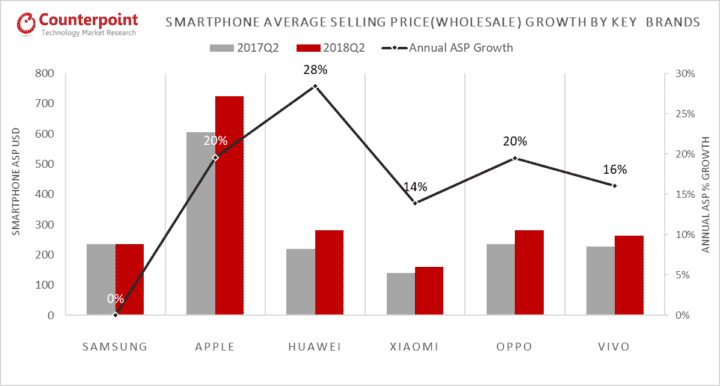 제조사별 스마트폰 판매 평균 단가 (출처: counterpointresearch)