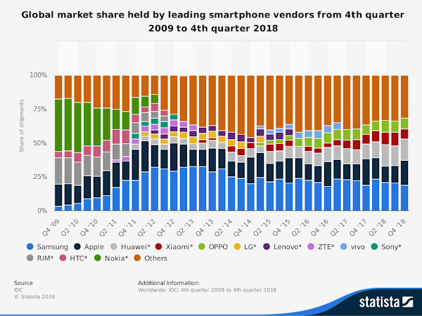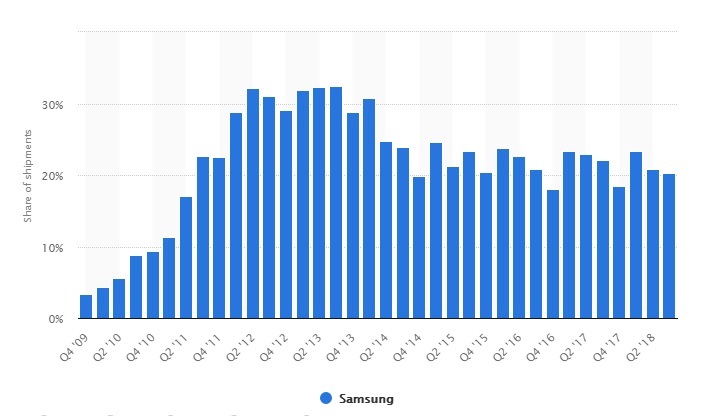 삼성 시장 점유율 하락 추세 (출처: statista)