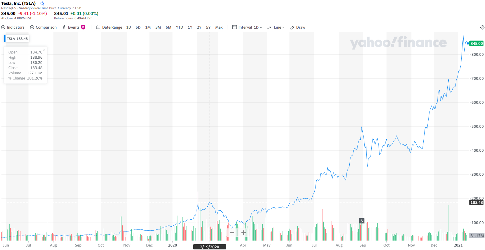 갓슬라 주가 by Yahoo Finance 갓슬라의 주가는 360.5% 상승하였다. 오오 그렇다면 순이익은...?! 2019년은 8억 6200만달러 손해였다가 2020년도에야 5억 5600만달러의 순이익을 추정중이다. 테슬라는 꾸준히 순손실을 기록하다가 2020년도에 처음으로 순이익을 기록하기 시작했다. 전기차에서는 어쩌면 애플 급의 위치를 차지하기도 한다.