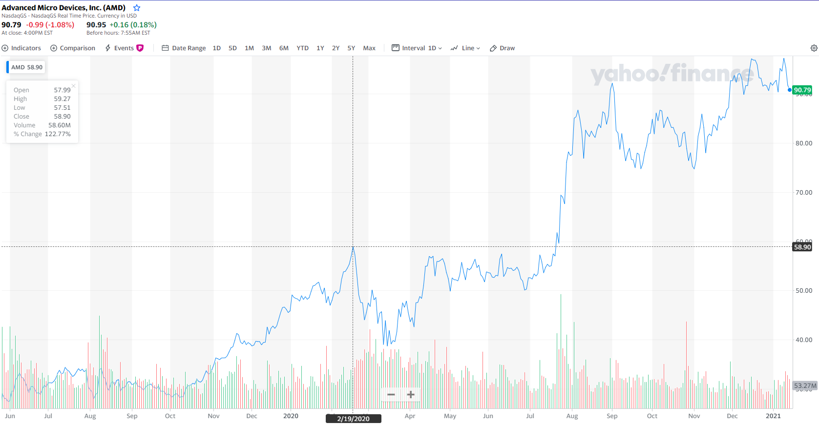 AMD 주가 by Yahoo Finance AMD는 CPU와 그래픽카드를 제조하는 회사다. 망할 뻔 하던 회사는 Lisa Su를 만난 이후 달라졌다. 줘도 안 가지던 CPU는 게이밍에서 인텔을 일부 누르며 대등하게 좋아졌으며, 연산에는 그냥 인텔을 압살하는 정도로 강려크해졌다. 하지만 그렇다고 매출이 주가를 따라간 것은 아니다. PER만 보아도 123년의 수익이 주가를 따라간다는 것 자체가 이미... 주가는 너무나 과열되었다는 것을 말한다.
