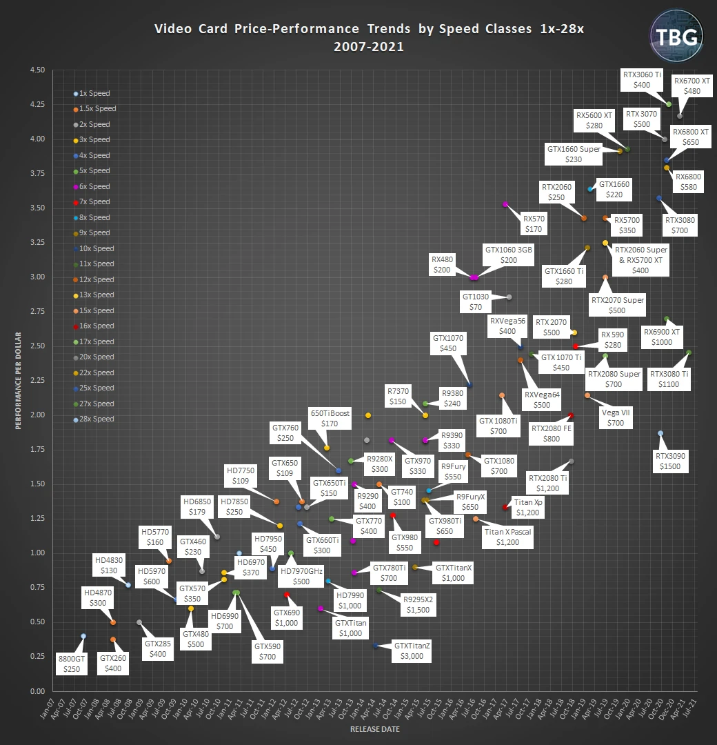 세 번째 요소는 매우 중요한데, 이는 컴퓨터 역사에서 CPU와 그래픽카드의 성능이 올라가는데 왜 가격이 유지/소폭 상승으로 그칠 수 있었는지에 대한 근거가 되기 때문이다. 만약 이것이 없었다면 CPU 가격은 지금 아파트 가격과 가슴 웅장한 경쟁을 했을 것이다. (NVIDIA 8800GT($250)의 28배 성능인 RTX3090은 $7,000의 가격이 되어야 하나 $699에, Intel Pentium IV 1.5(Willamtte/$819)의 740배 성능인 R9 7950X는 $605,899가 되어야 하나 $699에 판매되고 있다.)