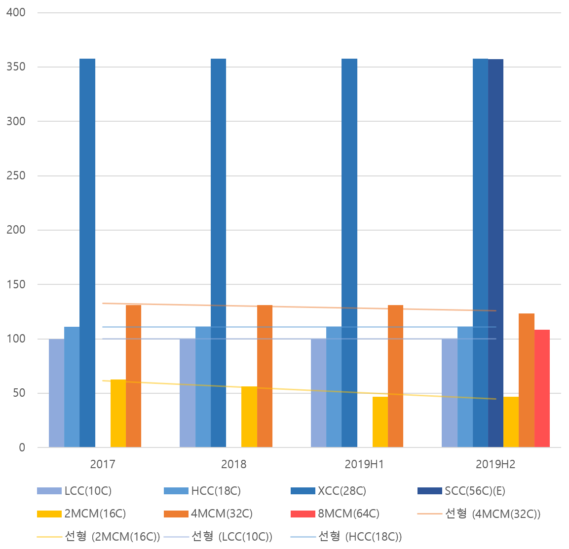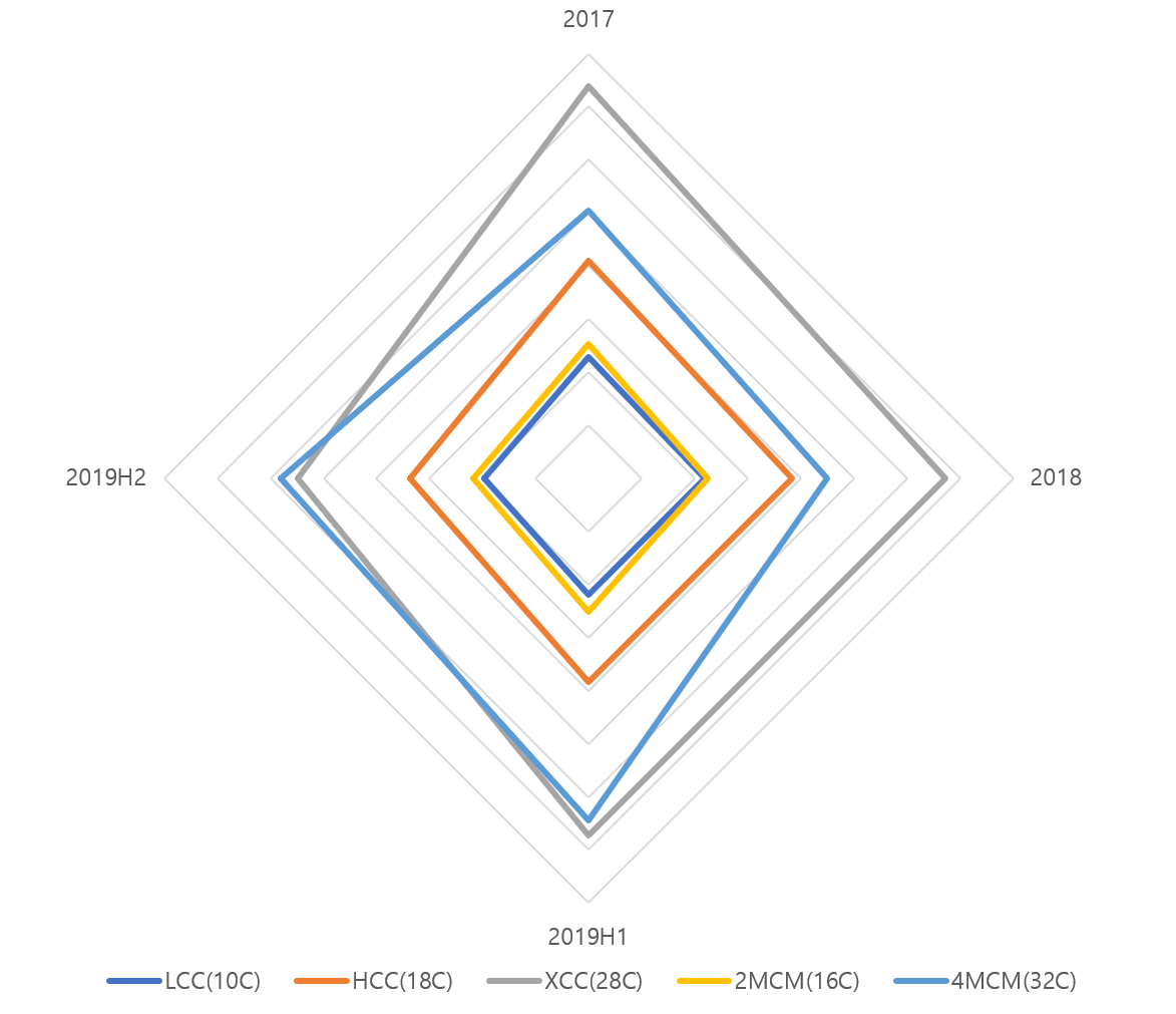 | 2018 | LCC (10C) | i9 9900X, Xeon W-2155 | 14.3 x 22.4 or 322 | 122㎟ - 91.5 | 2MCM (16C) | 2950X | 90 |